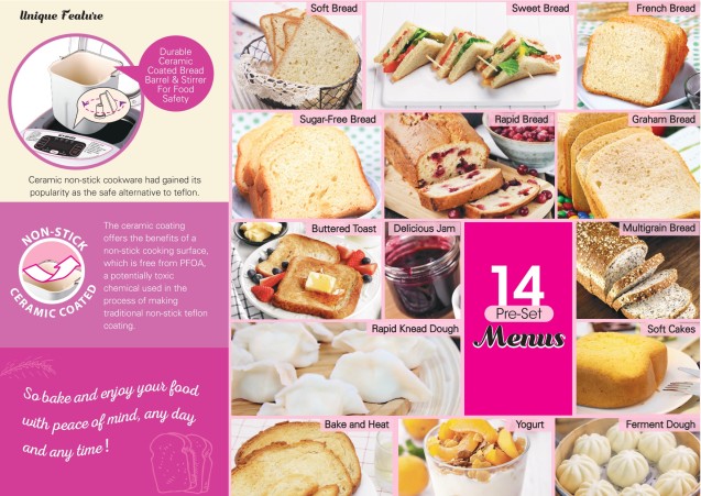 - (Soft Bread , Sweet Bread, French Bread, Sugar Gree Bread, Rapid Bread, Graham Bread, Buttered Toast, Delicious Jam, Multigrain Bread, Rapid Knead Dough, Soft Cake, Bake & Head, Yougurt, Ferment Dough)